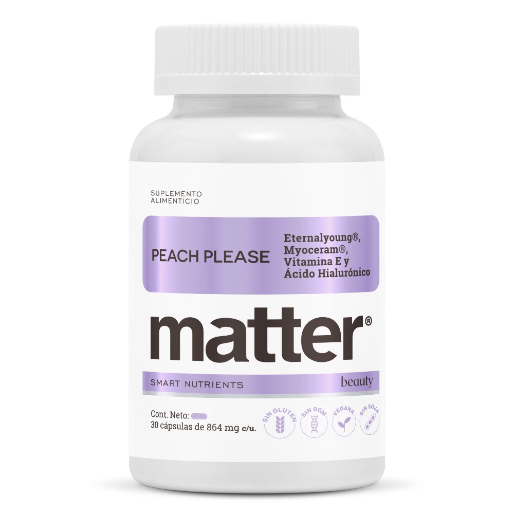 Peach Please, con ingredientes que promueven una piel bella y con vitalidad desde adentro. Eternalyoung®: Mezcla botánica patentada que frena los efectos del envejecimiento de la piel, promoviendo su regeneración y brindando una apariencia más joven y radiante. Myoceram®: Ingrediente natural a base de ceramidas de arroz, mejora la hidratación de la piel y reduce la pérdida de agua, mejorando la función de la barrera cutánea. Vitamina E: Antioxidante que protege las células de los daños causados por los radicales libres, contribuyendo a la salud y juventud de la piel. Ácido Hialurónico: Componente natural de la piel que retiene agua, mejorando la hidratación y elasticidad, y reduciendo la aparición de arrugas.
